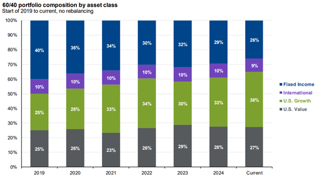 Over the past six years, stocks have performed well, outpacing bonds. Additionally, U.S. growth stocks have significantly outperformed U.S. value stocks and international stocks. If this portfolio were never rebalanced, it would become significantly overweight in U.S. growth stocks relative to other asset classes. While this isn’t inherently a problem, a portfolio with a large allocation to U.S. growth stocks will have a much different risk profile compared to a traditional 60/40 moderate portfolio. During a market downturn, the un-rebalanced portfolio is likely to suffer a larger loss than the original 60/40 allocation. This is why rebalancing is important—without it, investors may take on more risk than they initially intended.