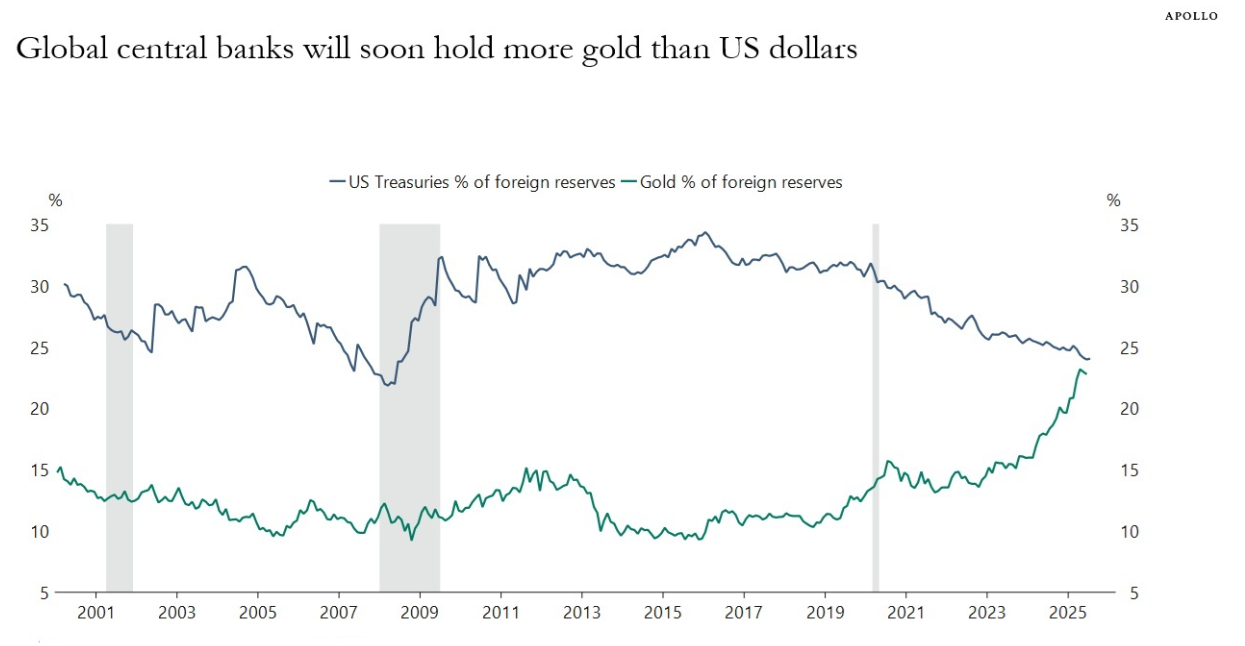 As illustrated in the chart, the green line represents the share of global central bank reserves held in gold. That share has climbed sharply, while holdings of U.S. Treasuries have declined. In short, central banks worldwide are shifting allocations away from Treasuries and toward gold.