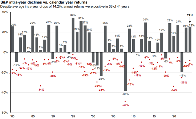 Returnsare based on price index only and do not include dividends. Intra-year dropsrefers to the largest market drops from a peak to a trough during the year. For illustrative purposes only. Returns shown are calendar year returns from 1980to 2023, over which time period the average annual return was 10.3%.