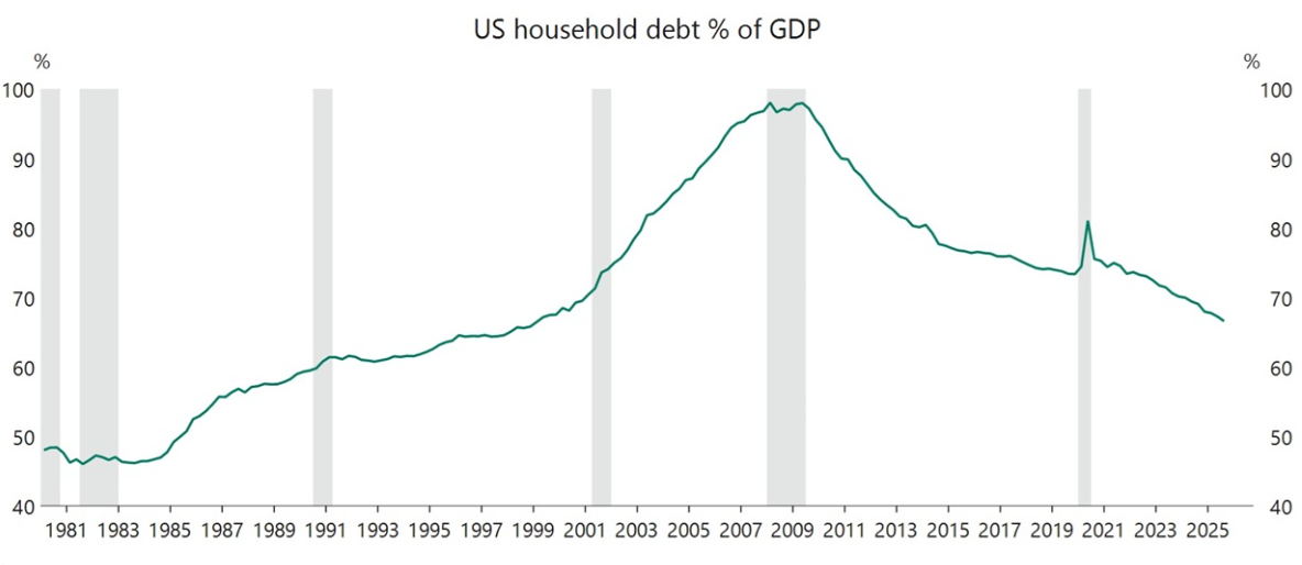 In contrast, government debt as a percentage of GDP has moved sharply higher over the same period. While household leverage remains contained, federal borrowing has expanded considerably—an important dynamic to monitor as policymakers navigate future fiscal decisions.