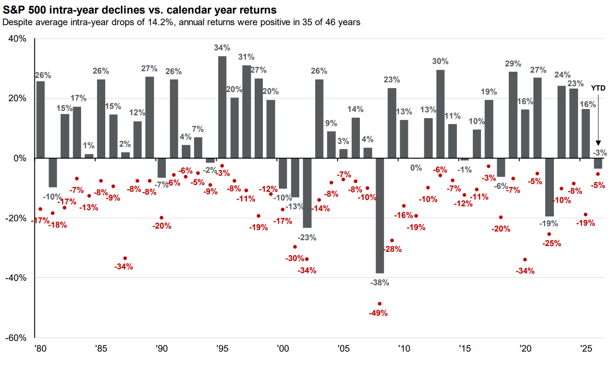 As noted above, the S&P 500 experiences an average peak-to-trough decline of 14.2% in any given year. At present, the market’s drawdown is roughly half that level. Data from JPMorgan, tracking annual declines since 1980, shows that while deeper pullbacks are not uncommon, equities have still delivered positive full-year returns approximately 76% of the time.