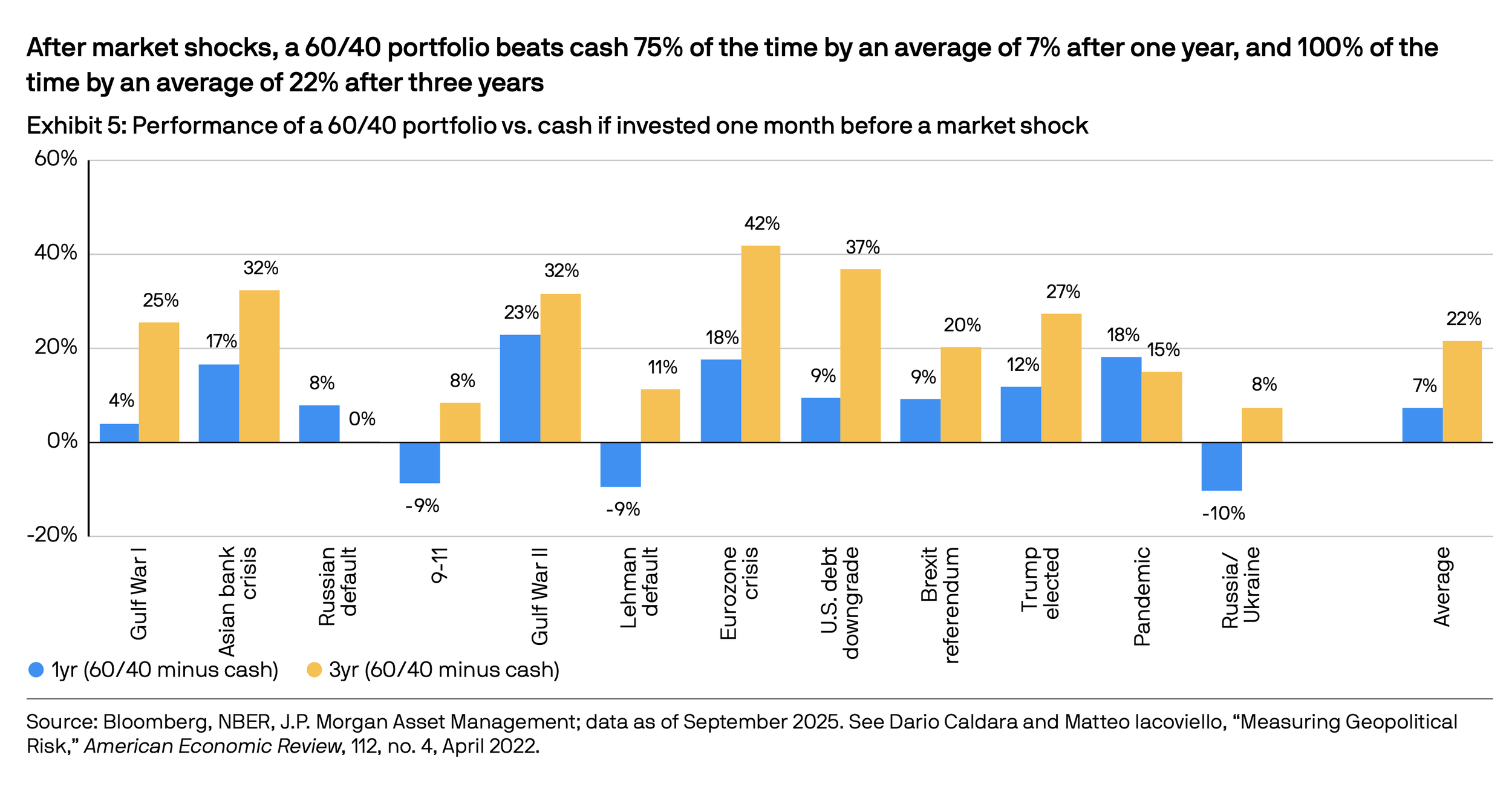 “Following major geopolitical shocks, a diversified 60/40 portfolio has historically outperformed cash 75% of the time after one year—and 100% of the time after three years.”
