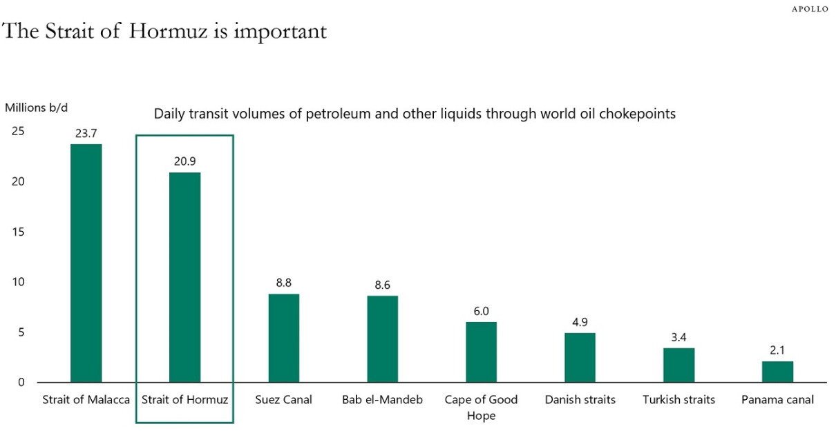 One of the primary reasons for the recent surge in oil prices is Iran’s restriction of oil tanker traffic through the Strait of Hormuz. This week’s chart, sourced from Apollo Asset Management, highlights the significant volume of oil that normally passes through this critical shipping route. Approximately 20% of the world’s oil supply moves through the strait each day.