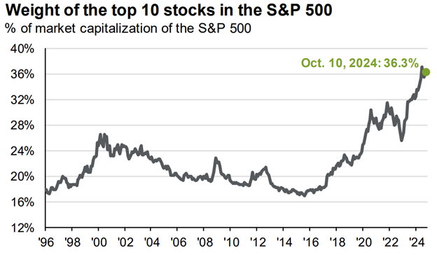 Source: FactSet, Standard & Poor’s, J.P. Morgan AssetManagement. The top 10 S&P 500 companies are based on the 10 largest index constituents at the beginning of each month. As of 9/30/2024, the top 10companies in the index were AAPL (7.1%), MSFT (6.5%), NVDA (6.1%), AMZN (3.6%),GOOGL/GOOG (3.6%), META (2.5%), BRK.B (1.7%), AVGO (1.7%), TSLA (1.5%) and LLY(1.4%).The remaining stocks represent the rest of the 492 companies in theS&P 500.